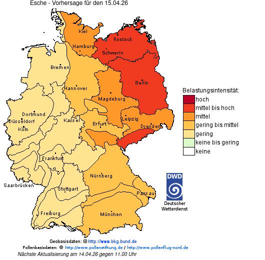 Hier geht es zur Pollenflug-Vorhersage von Esche für heute, Mittwoch, den 15. April 2026.