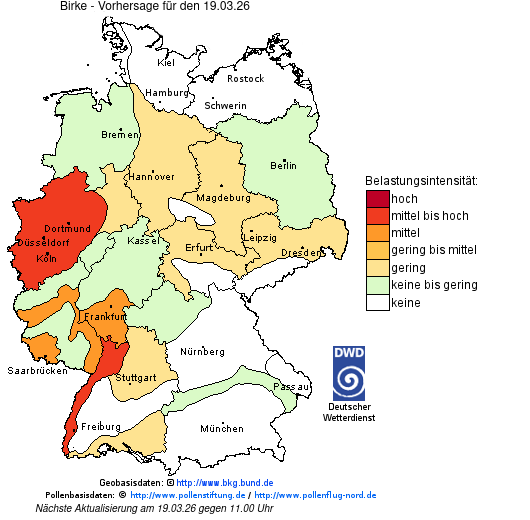 Auf Grundlage des Pollenflugkalenders des Deutschen Wetterdienstes stellen wir Ihnen hier die aktuelle Pollenflugvorhersage für heute, Mittwoch, den 14. Januar 2026 für Hessen für die Pollenerreger Birke zur Verfügung.